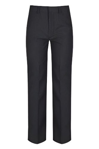 Classic fit junior boys trousers, flat front style with elasticated waistband and stain resistant finish. Ages 4-6 are pull on with mock fly & ages 7+ have a functioning zip fly.